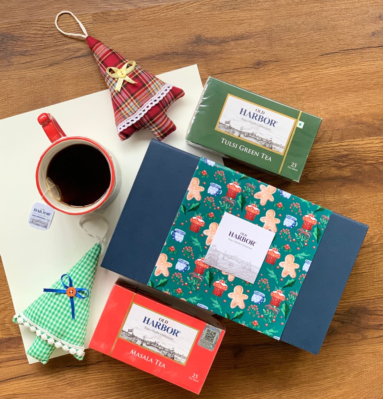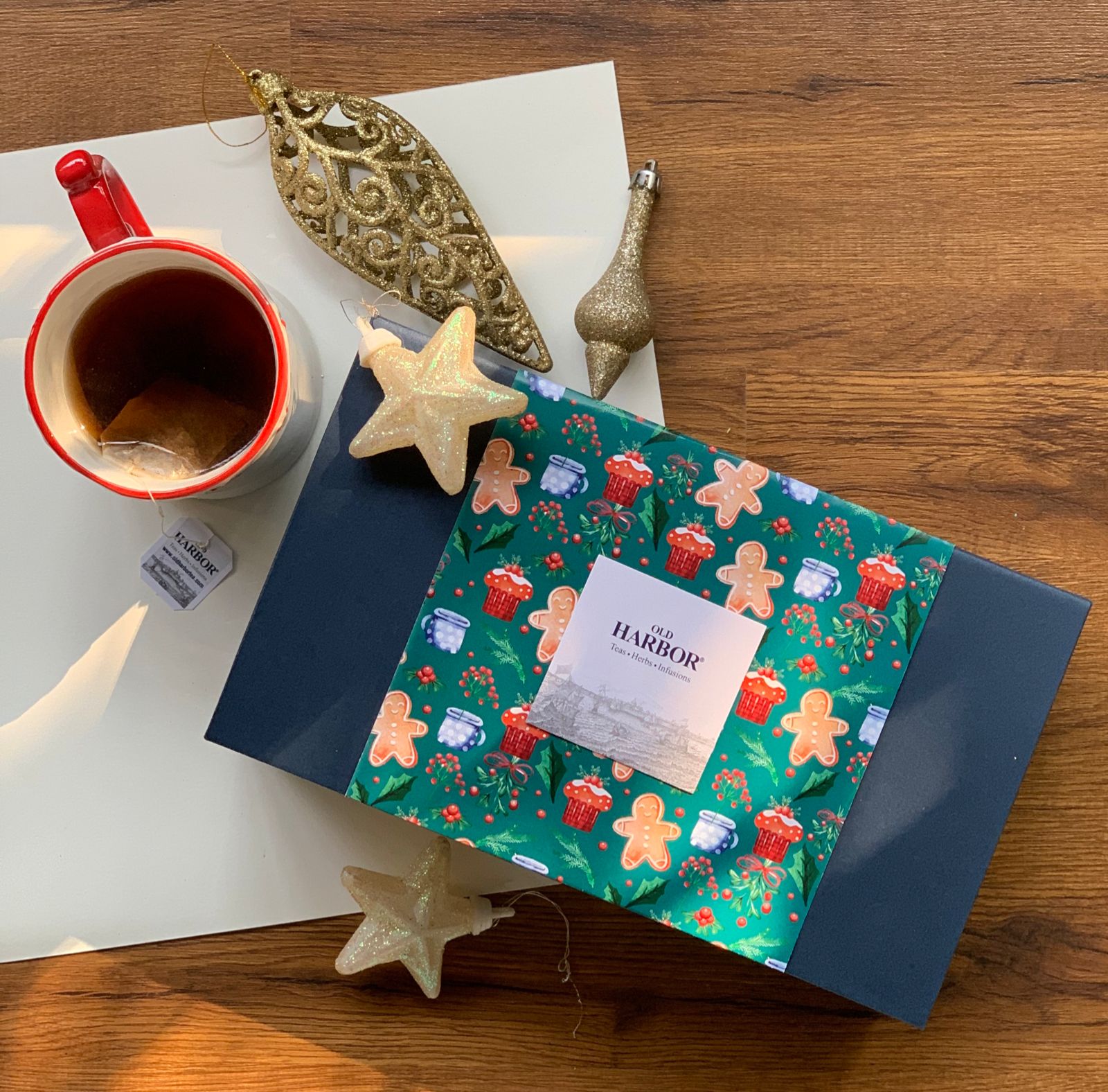 Old Harbor Christmas gift pack contains 4 items (2 pack of teas & 2 pack of christmas tree ornaments)